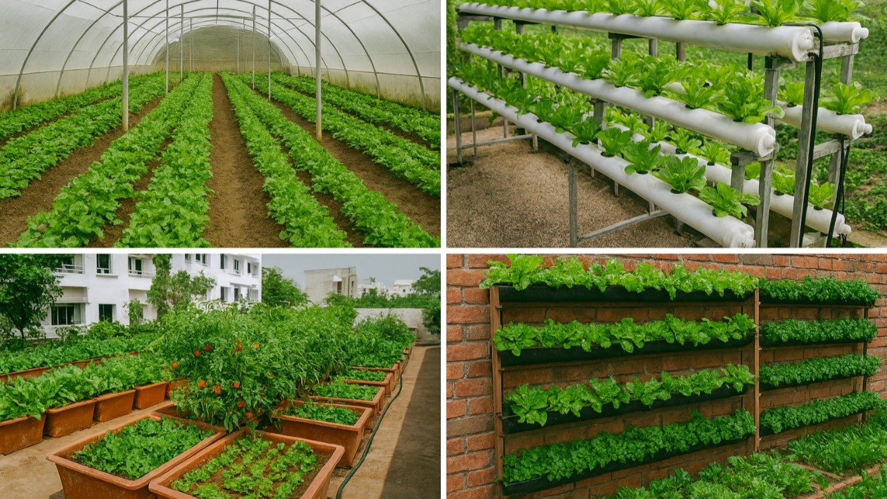 Display of polyhouse, hydroponics, rooftop gardens, and vertical farming.